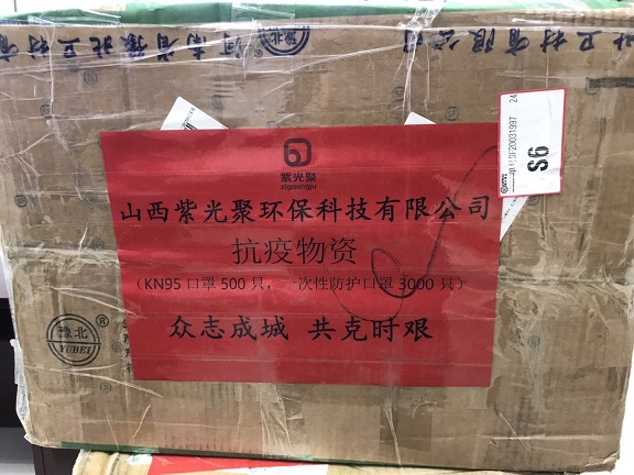 3月7日,山西紫光聚環(huán)??萍加邢薰揪栀?zèng)的口罩交接到位。