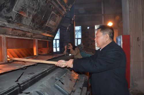 (城發(fā)公司副總經(jīng)理梁永慶,手持火把密切關(guān)注爐膛內(nèi)火焰燃燒的態(tài)勢。李波攝)