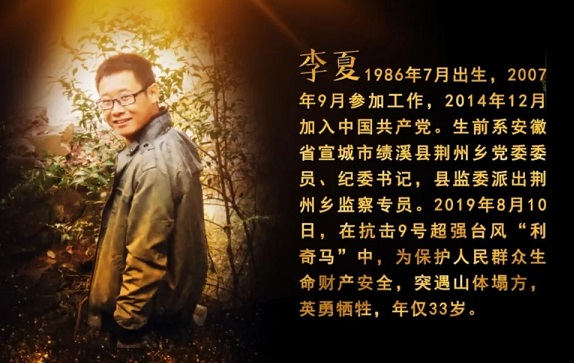 影片中,李夏同志生前是安徽省宣城市績溪縣荊州鄉(xiāng)黨委委員、紀(jì)委書記,縣監(jiān)委派出荊州鄉(xiāng)監(jiān)察專員。他堅定理想信念、堅守初心使命,十余年來,始終奮戰(zhàn)在脫貧攻堅、鄉(xiāng)村振興、正風(fēng)肅紀(jì)第一線。他堅持原則、一身正氣,在紀(jì)檢監(jiān)察工作崗位上,敢于較真碰硬,鐵面執(zhí)紀(jì)執(zhí)法,突出整治群眾身邊腐敗和作風(fēng)問題,推動全面從嚴(yán)治黨不斷向基層延伸。2019年8月10日,在抗擊臺風(fēng)利奇馬時以身殉職,年僅33歲。