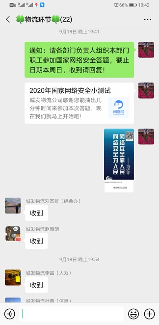宣傳周期間,在公司醒目處張貼2020年國家網(wǎng)絡安全宣傳海報,號召大家積極參與有獎問答、線上參觀,觀看線上論壇、講座等活動。還組織公司廣大干部職工62人,以線上答題的形式進行《2020年國家網(wǎng)絡安全小測試》答題活動。