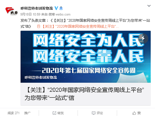 9月14日至20日,根據(jù)城發(fā)公司2020年國家網(wǎng)絡安全宣傳周實施方案要求,城發(fā)物流公司組織全體黨員干部職工積極開展2020年國家網(wǎng)絡安全宣傳周系列活動。