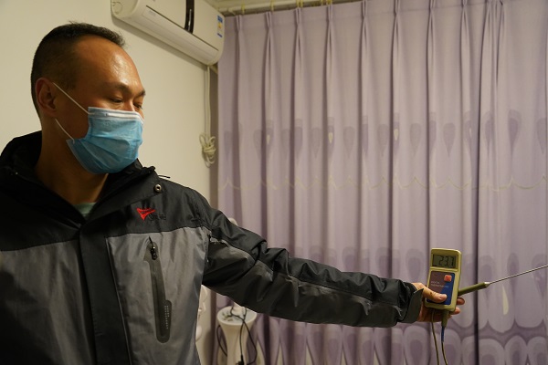 在20號樓3單元6樓的住戶家中,劉婷用手摸了摸用戶家的地板磚,通過人體的直觀感受,發(fā)現(xiàn)用戶家地暖存在散熱不均勻的現(xiàn)象。客服管家用專業(yè)的測溫儀和熱成像儀,進行了測溫。經(jīng)檢測,該用戶家各房間平均溫度均在23℃以上。用戶說,家中較冷的房間是廚房,客服管家又針對廚房進行了測溫,發(fā)現(xiàn)室溫要比其他房間溫度低一些,但熱成像儀測得的結(jié)果與其他房間一致。經(jīng)過觀察與分析,發(fā)現(xiàn)用戶家廚房與陽臺間的隔斷是一扇落地大玻璃門,保溫效果較差,導致廚房溫度低于其他房間。聽了工作人員的講解,用戶也表示了認可,對我們的排查結(jié)果及服務態(tài)度表示滿意。