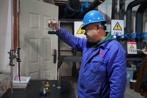 在水化A車間,劉丁一穿上工作服,戴上防護用具,立刻進入工作狀態(tài)?;灩ぷ骺菰锓ξ叮珜|(zhì)量的要求卻精益求精,從接樣到測量再到數(shù)據(jù)分析,他嫻熟地倒著試劑、觀察著試劑瓶,一支燒瓶、一些水、幾滴試劑,隨著劉丁一搖晃的燒瓶,漸漸的,瓶子中的水從紫紅色,變成了淺藍色。為了檢驗軟化水的質(zhì)量是否達標,確保鍋爐一次網(wǎng)用水安全,這一天他要對水質(zhì)至少進行8次檢驗。