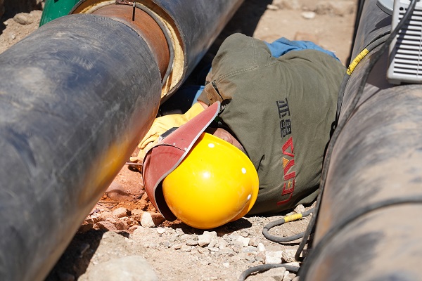 剛到現(xiàn)場,眼前是一大片比人還高的土堆,跟著現(xiàn)場的工作人員,繞著土堆走了大一圈,才看到了5米多深的管溝。當天正是二十四節(jié)氣中的小暑,雖然在前兩天剛下過一場大雨,但絲毫沒有消減半分暑氣,但是溝內(nèi)的工人們,沒有因為天氣炎熱而消極怠工,按照安全生產(chǎn)的著裝要求,頂著毒辣的太陽,全副武裝、緊鑼密鼓地干著手中的活。豆大的汗珠順著他們黝黑的臉不停的滴落,但他們似乎完全沒感覺到。