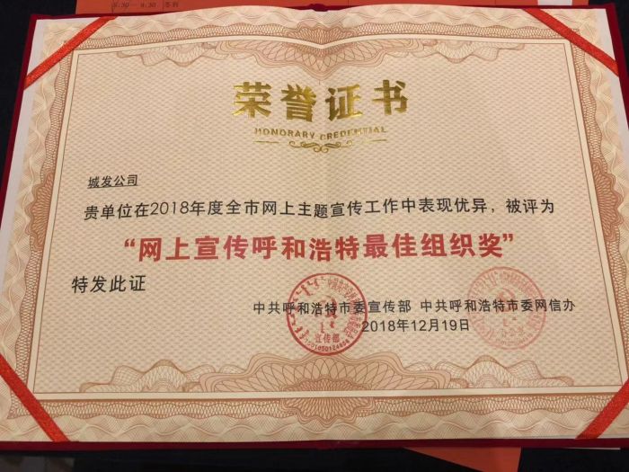 年度網(wǎng)上宣傳呼和浩特最佳組織獎(jiǎng)。