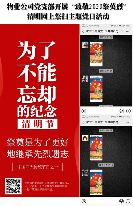 4月2日,城發(fā)物業(yè)公司黨支部組織開(kāi)展“致敬2020祭英烈”清明網(wǎng)上祭掃主題黨日活動(dòng)。