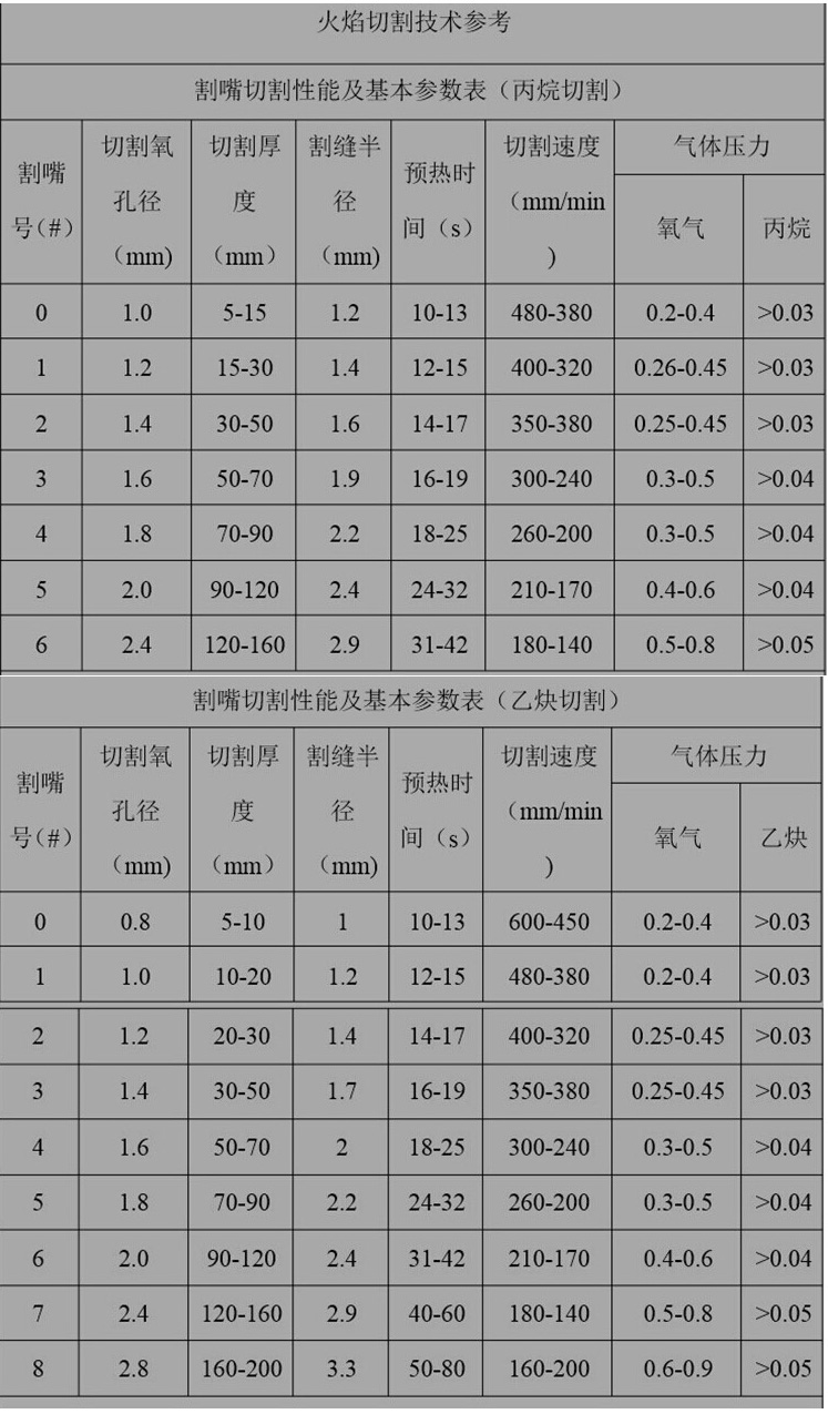 奧焊公司火焰切割割咀技術參數(shù)表: