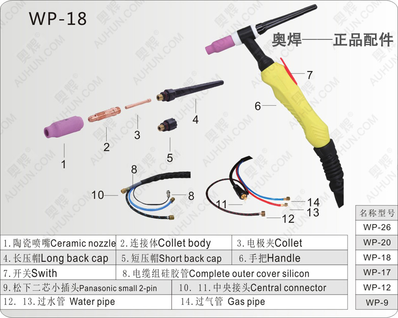 WP-26氣冷氬弧焊槍適用于315A以下的氬弧焊氣冷焊機使用,一般小電流時使用。