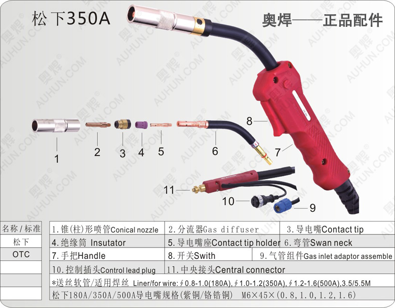 松下350A二氧化碳氣保焊槍(氣冷式)適用于:250A-350A氣保焊機使用,暫載率60%時焊機電流350A,使用焊絲直徑:0.8-1.2MM,其他品牌:歐式、大電、濟南創(chuàng)菲美、原裝黑狼、諾斯款等(歡迎訂購)。